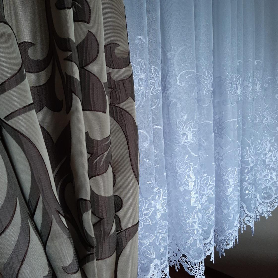 - Rozmiar pojedynczego szala szerokość 150, długość 180, wykończenie taśmą równo-marszczącą