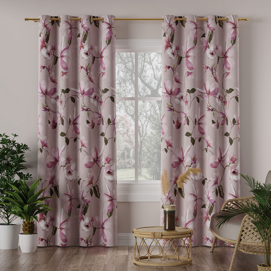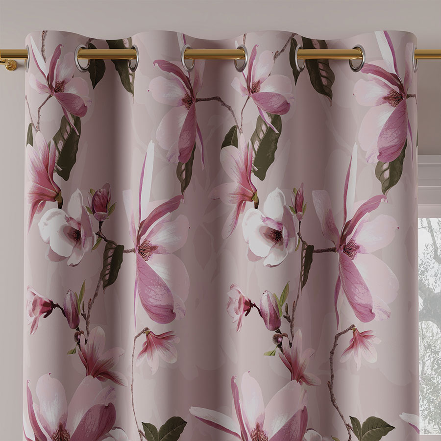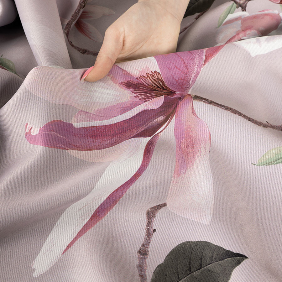 Tkanina zasłonowa MAGNOLIA to materiał pokryty pięknym wzorem kwiatów magnolii. Dzięki temu, że jest to materiał typu blackout mamy zapewnione pełne zaciemnienie w pokoju. Takie zasłony są idealne również na lato ponieważ blokując promienie słoneczne zapewniają chłód w pomieszczeniu.