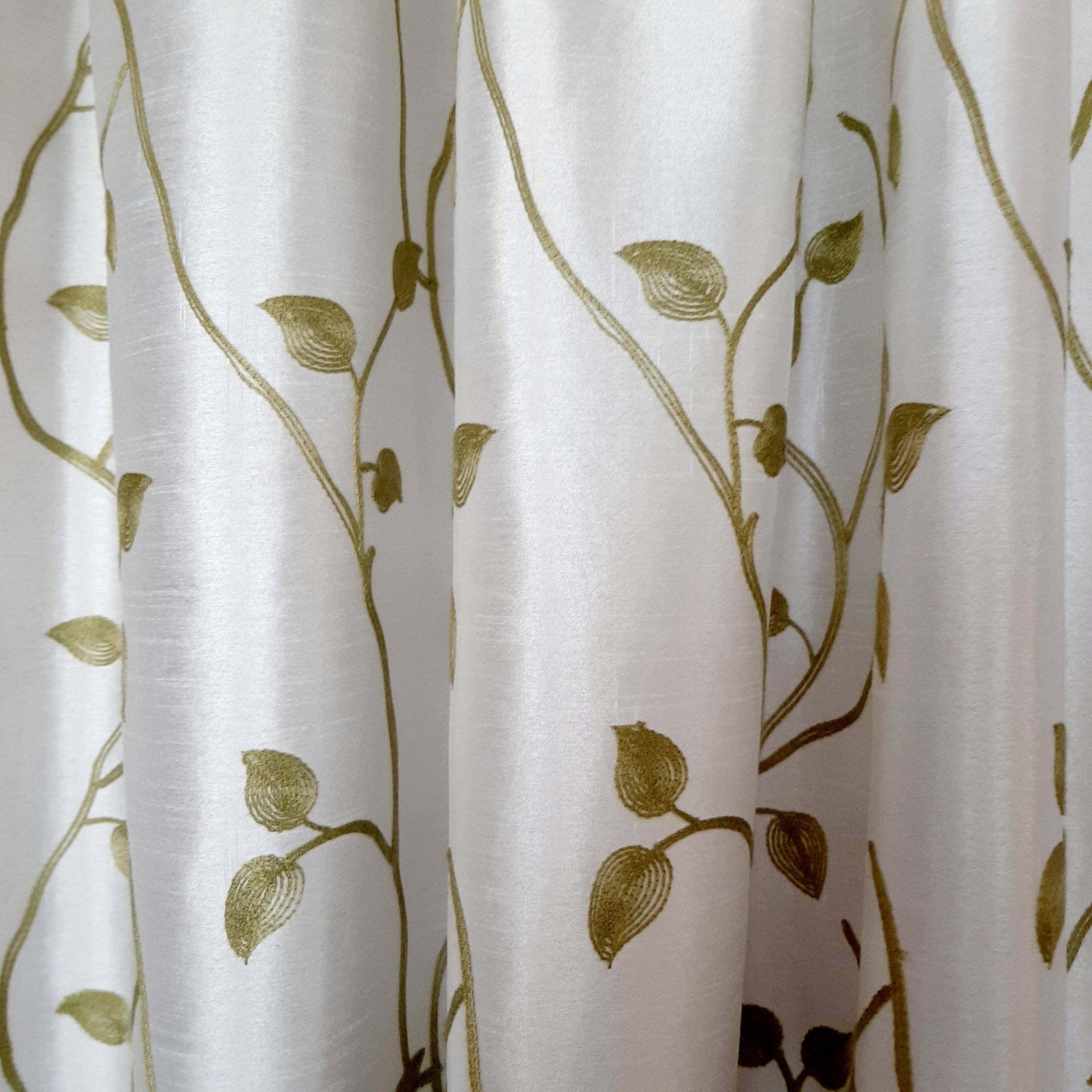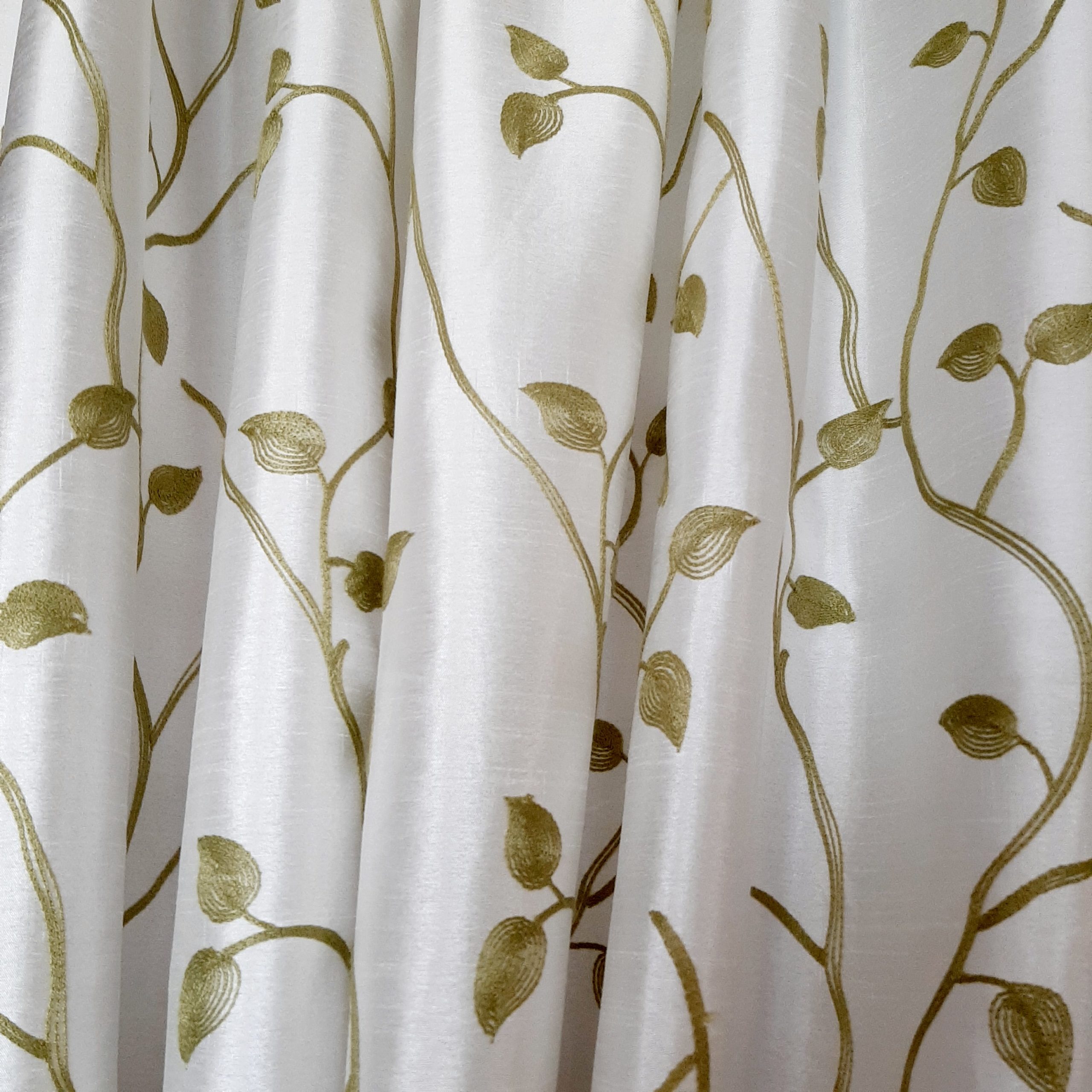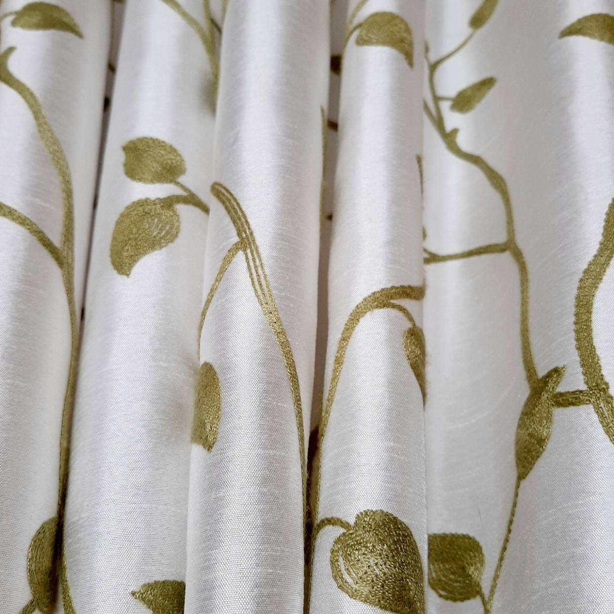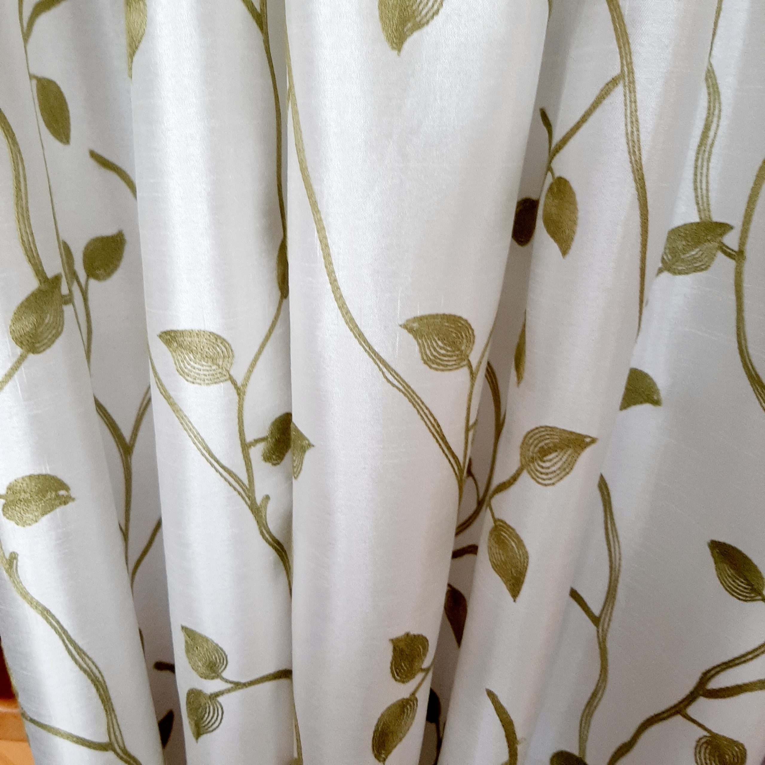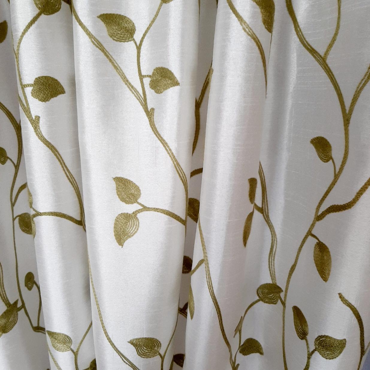 Zasłony metraż. Kiedy zbliża się czas letni staramy się zmienić aranżację naszych domów, dla tego mała innowacja w wystroju daje dużą satysfakcję. Proponuję piękne zasłony z połyskującej tkaniny – tafta syntetyczna- wyszywanej w zielone pnącza i liście. Ponieważ tkanina jest kryjąca a zarazem lekka nadaje się również na roletę rzymską do kuchni lub jadalni .